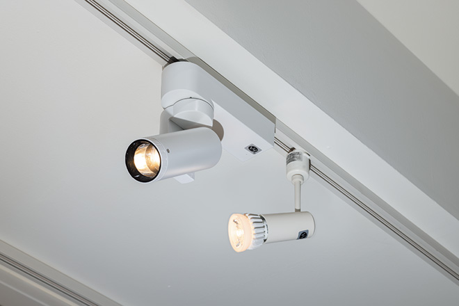 Additionally, high color rendering Ra90 type spotlights with wireless controls have been deployed for the hanging display areas inside the store area, delivering a lighting scheme that effectively accentuates the colors and textures of "Sybilla Coloring".
