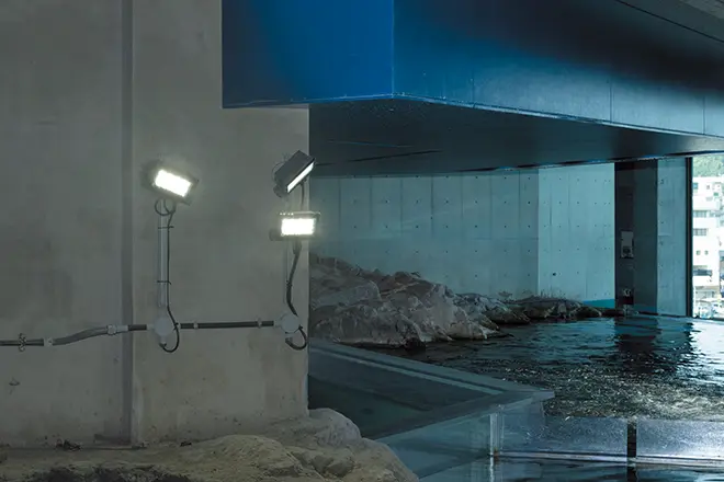 The "Kanmon Straits" tank has been furnished with a combination of high-color-rendering indoor-use LEDioc FLOOD AVANT class 400 and LEDioc FLOOD NEO class 80 floodlights, while the tank containing the tiger pufferfish - renowned as a particularly exotic variant - is furnished with LEDioc FLOOD NEO class 120 floodlights above the tank and LEDioc MULTILINE trough-shaped LED floodlights along the back, creating a greater sense of depth than ever before. Light colors, luminance, and presentation methods have been tailored to the respective themes of each exhibition area to create a space where visitors are able to experience the combination of the rhythm of light together with the diversity of the ocean. The adoption of LED lighting fixtures which deliver brightness levels on a par with the existing mercury and sodium lamps, has resulted in significant energy savings together with exhibits that are clearer and more vivid, which has been well received by visitors.