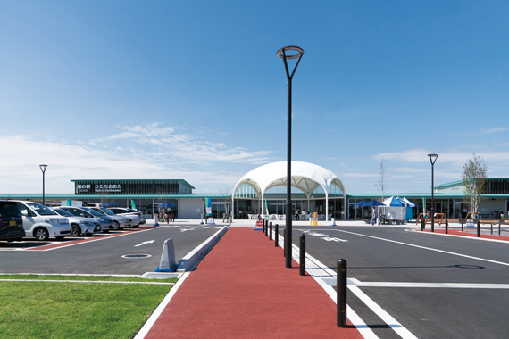 Add to My ListMichi-no-Eki (Roadside Rest Area) Hitachiota opened in July of last year in Ibaraki Prefecture's Hitachiota City, alongside the National Route 349 Bypass. The facility is a combined-type hub for interaction established with the aim of encouraging regional industry and revitalizing the local area. It has a lot area of 2.2ha, a facility area of 1555.30m², and features a large parking area with parking for 208 regular vehicles, 14 large vehicles, and 3 drivers with disabilities. It serves to communicate the appeal of Hitachiota City, and as a place where people can gather and interact, and it can also fulfill the role of an evacuation spot in times of disaster and function as a base for disaster recovery activities. It has a full range of facilities, including an area selling local produce, a restaurant, a food court, an event plaza, a children's plaza, and a tomato greenhouse offering a hands-on picking experience, and also has attached restrooms and a convenience store. LEDs have been used for the facility lighting from the viewpoint of power savings, and LED lighting has also been used for the lighting for the facility's pedestrian walkways and parking area. LEDioc AREA type-D streetlights have been used for the outdoor road lighting, as they feature a ring-shaped design that makes use of the strengths of LED for omnidirectional light distribution. Furthermore, in order to preserve the daytime scenery, lighting equipment has not been erected along the inner range of the spacious parking area; instead, the entire area is lit with 80W LEDioc FLOOD BLITZ floodlights on 10m concrete poles from the outer periphery, which makes for a less cluttered space, and the consensus is that the creation of a safe and comfortable lighting environment has been enabled through sufficient consideration of lighting fixture selection and arrangement.