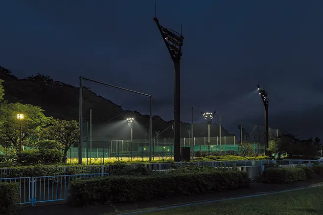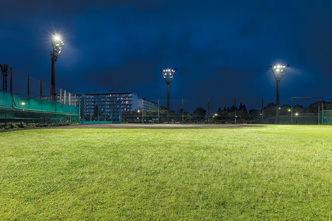 The baseball field at the site is widely used by many across all levels, both for practice and competitive matches in formats including softball, rubber-ball baseball and youth baseball, and with a view towards reducing both energy consumption and the burden of maintenance, the municipal authorities completed works to upgrade the lighting installation at the field to LED. The proximity of the field location to an area of rich greenery and housing complexes required careful consideration of avoiding light pollution, and the LEDioc FLOOD AVANT Light Pollution Prevention type class 1000 floodlights selected for the scheme use proprietary light control to prevent light spillage which is a cause of light pollution. Installing an optimal combination of wide, medium, and narrow beam angle types, the scheme has delivered significant energy savings whilst maintaining brightness levels equal on a par with the previous scheme with HID floodlights; the result is a pleasant environment in which play can continue to be enjoyed by night, while suppressing light spillage into the surrounding areas.