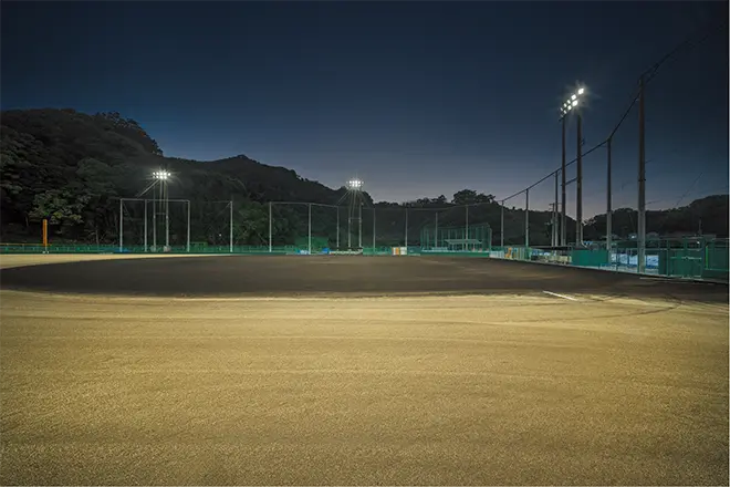 Renovation works to upgrade the stadium lighting to LED were completed by the city in March 2025, as part of its wider energy-saving efforts. The grounds are used frequently, and with a standard illuminance designed at 300ℓx for the infield and 200ℓx for the outfield, it meets Category III JIS lighting athletics standards (primarily recreational) for rubber ball baseball. With the high-efficiency LEDioc FLOOD AVANT class 400 floodlights which replaced the existing installation producing brightness levels equivalent to those of a 1000W metal halide lamp, they have delivered significant energy savings together with a comfortable viewing environment and high levels of light uniformity.
