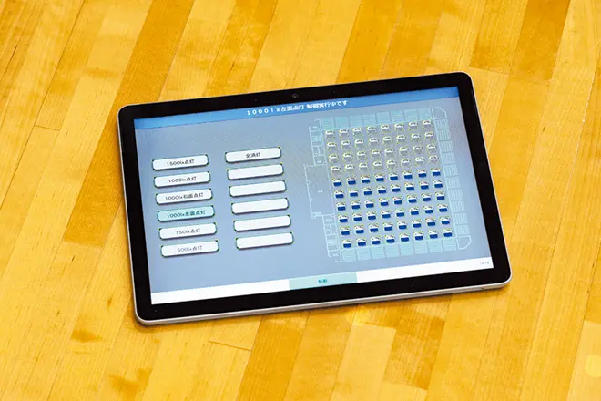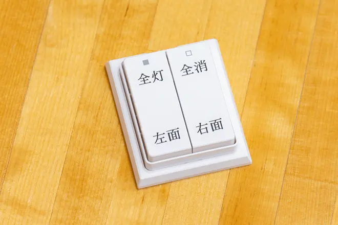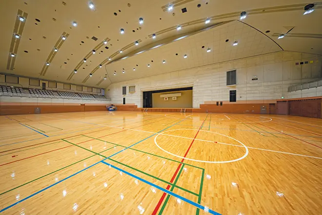During these works the lighting was also updated to LED, with the introduction of LEDioc HIGH-BAY Γ Wireless Control type fixtures delivering and sustaining an average illuminance of 1500ℓx and enabling the venue to accommodate professional level basketball matches in the B League. Incorporating the Wi-CONNECTY tablet operated wireless controls system to control dimming operations via communication between a dedicated base unit and receivers installed in each fixture, every fixture in the scheme can be dimmed and switched on and off individually; a tablet based GUI (Graphical User Interface) function facilitates easier, on-screen control of individual or pattern-based lighting. There are currently seven pre-set dimming arrangements in place: 1500ℓx, 1000ℓx, 750ℓx, 500ℓx, and additionally 1000ℓx on the right side of the arena as seen from the entrance, 1000ℓx to the left, and full lights off; by using our proprietary wireless control switch, the three most frequently used patterns of (full lighting scheme at 1500ℓx; right side at 1000ℓx; left side at 1000ℓx) can be activated easily.