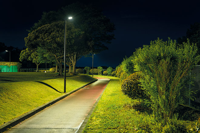 With the aid of a grant from the sports promotion lottery, improvement works on the lighting facilities of the multi-purpose field saw the installation of high-efficiency, high color rendering LEDioc FLOOD ZEST simple model class 500 LED floodlights. Reducing the number of floodlights from 108pcs under the existing scheme to 78pcs under the new scheme, far-reaching energy savings have been achieved whilst still managing to improve brightness levels and creating a pleasant lighting environment that pays due consideration to the avoidance of glare. Retaining the existing lighting columns and replacing only the floodlight units, LEDioc TENNISTAR 500W type floodlights which are designed specifically for use on outdoor tennis courts and offer brightness equivalent to a 1kW metal halide lamp have been installed, leading to energy savings being achieved whilst still maintaining and bettering the brightness levels of the existing scheme.