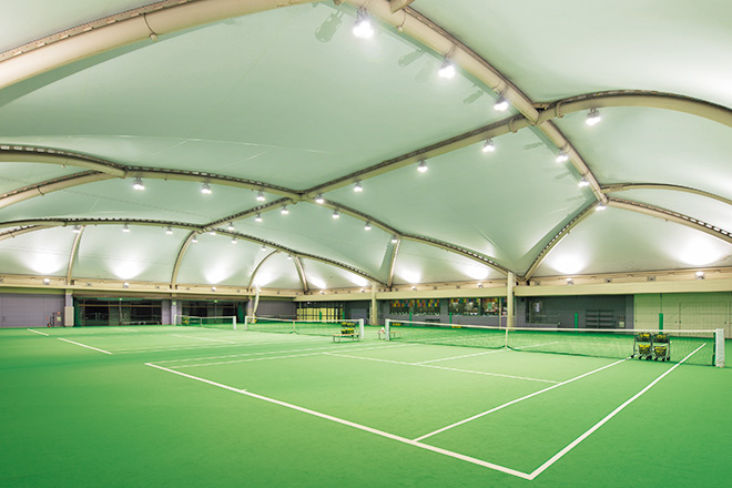 Indoor tennis courts at a long-established tennis club located in a wonderful environment lit by LED lighting to realize a favorable visual environment